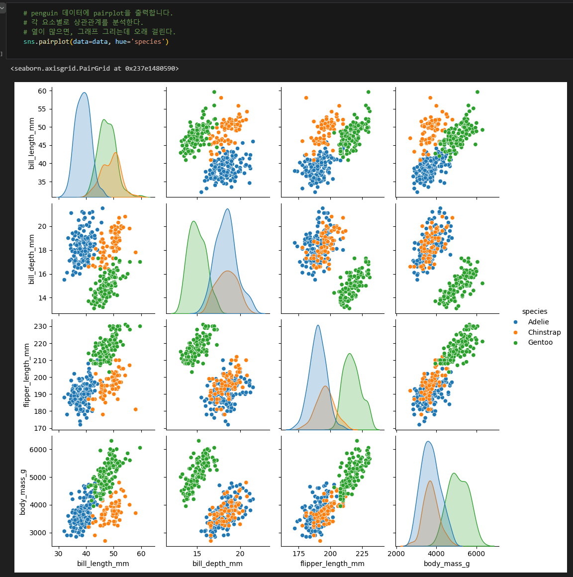 데이터 간에 서로에게 영향을 주는 어떠한 상관 관계를 한번에 파악할 수 있도록, pairplot을 그리는 방법이다.