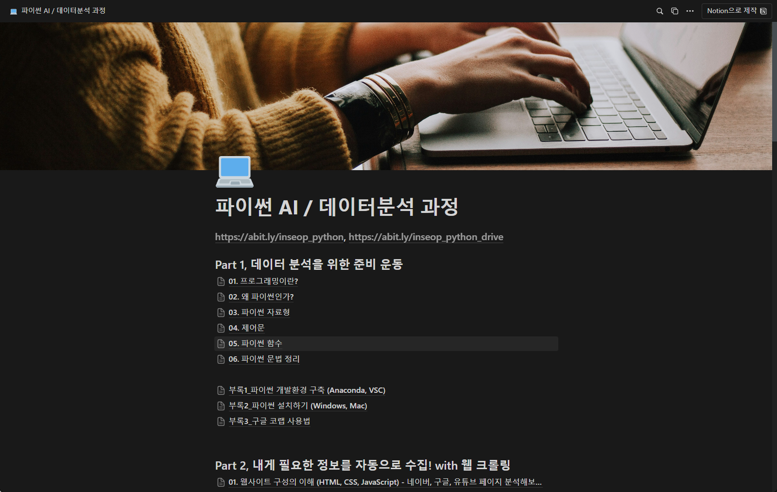 교안은 강사님이 미리 작성하신 노션 문서를 공유해 주셨다.